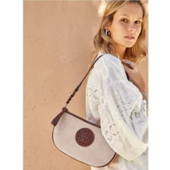 Rich, aromatic leathers accent this elegant and sophisticated canvas shoulderbag filled with handcrafted details.